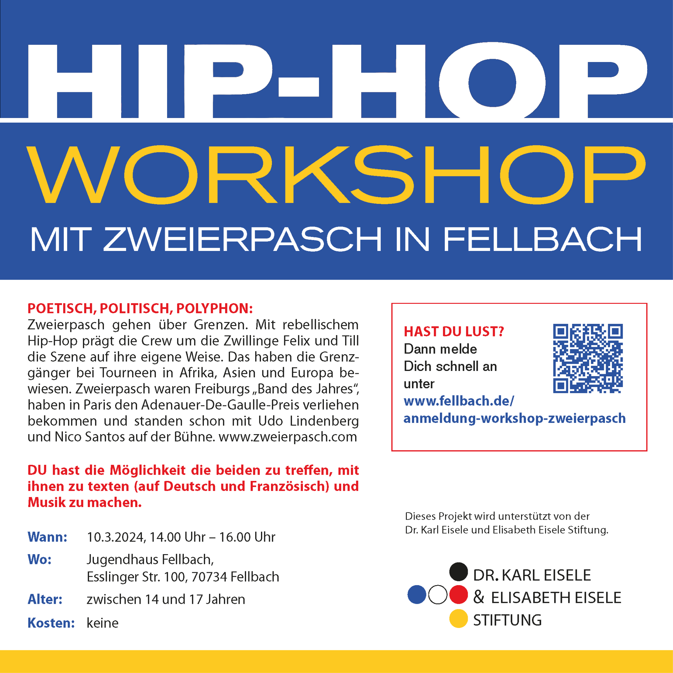 HAST DU LUST? Dann melde Dich schnell an unter www.fellbach.de/anmeldung-workshop-zweierpasch